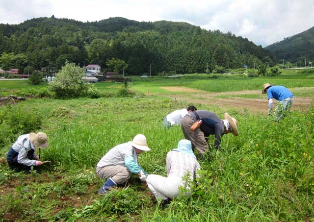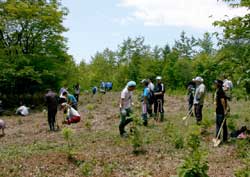 ● 森の教室 6月23日(日) 午前中は植林地に自生する植物の調査について話し合いました。調査チームは後藤さんをチーフにメンバーは仲村、松尾、大槻、森山という体制で発足しました。そのあと、自然観察路を歩き写真を撮り、標本用植物を採取しました。午後は採取した植物の研究をしました。この日の参加者は6名でした。 苗畑では夏草が苗木を覆い尽くしていました。11名の参加者により、窒息状態の苗木の救出作戦を敢行しました。参加者のがんばりにより、雑草が取り除かれた畑は再び苗畑に戻りました。この日白石市は、最高気温28.8度を記録しました。草取りをがんばり過ぎて参加者の一人が熱中症の症状を訴えましたが、症状が軽かったので大事には至りませんでした。午後は植林地の観察会を行いました。 ● 研修旅行 6月15日(日)〜16(日) 真山・本山お山かけ(男鹿半島旅行)を行いました。報告はGRニュースを参照してください。 ● 植林祭 6月9日(日) 白石市との共有地での植林祭は、植栽がほぼ行き渡ったため今年が最後となりました。植林祭当日は天気にも恵まれ、熱中症が心配になるほどの陽気でしたが、暑さに負けることなく、無事用意した約300本の苗木を植えました。白石市との共有地での植林活動は、この日の植林でひと区切りついたと言えます。来年からは、枝打ちなどの保育作業や自然観察路整備が植林祭に代わるイベントの中心的な活動となります。その予行演習的な試みで、今回は植林と並行して枝打ち作業も行いました。作業の後はウッドゲーム(木の名前当てクイズ)で参加者と交流を深めました。